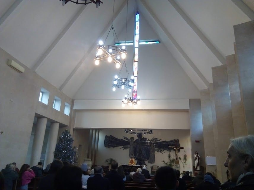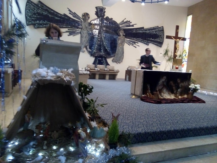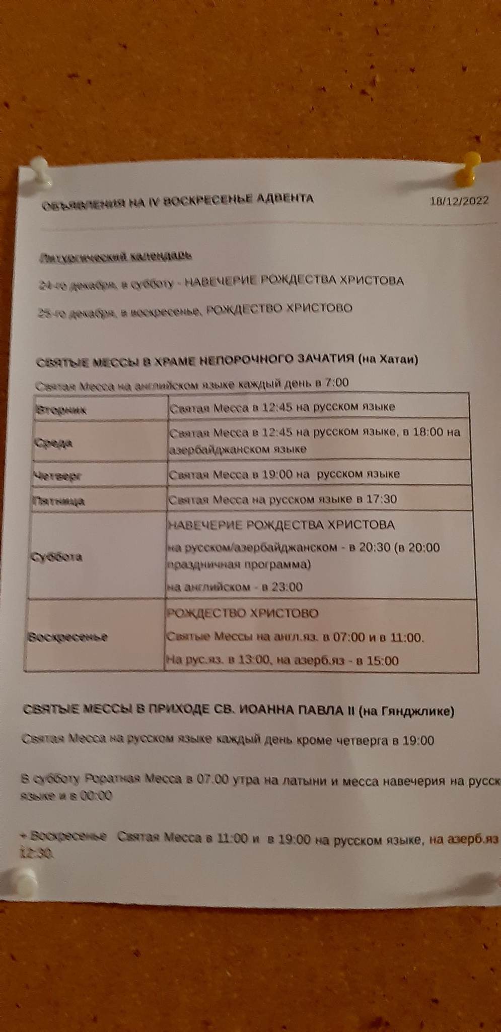 Бетонный католический костел в Баку, с высокими соединяющимися вверху двумя стенами, в зале всего две скульптуры рядом со сценой больше ассоциируются с дискотекой для верующих старшего поколения. Легкий электроорган с певцами у входа это впечатление усиливают. Поэтому больше внимания остается слушать ксендза - правильно я назвал читающего проповедь священника?
