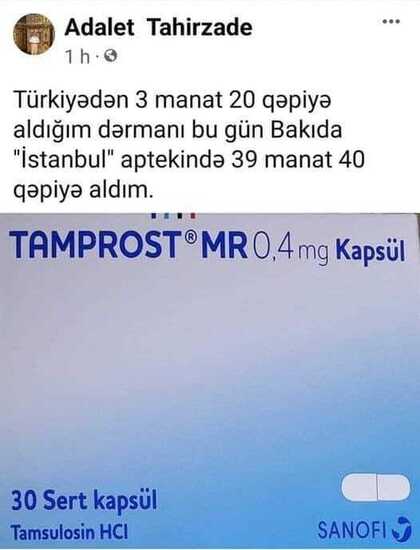 Депутат Милли Меджлиса Адалят Тахирзаде, наверное, впервые в жизни заболел. Купил в бакинской аптеке лекарство "Тампрост" за 39 манат 40 гяпик, которое приобретал в Турции за 3 ман 20 гяп.
