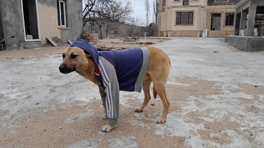 Утром решили: поискал в шкафу, нашел старые детские вещи, подобрал спортивную куртку внука и вот он: ошалевший, неподвижный от новых ощущений боевой пес "Лорд", мой охранник и собеседник