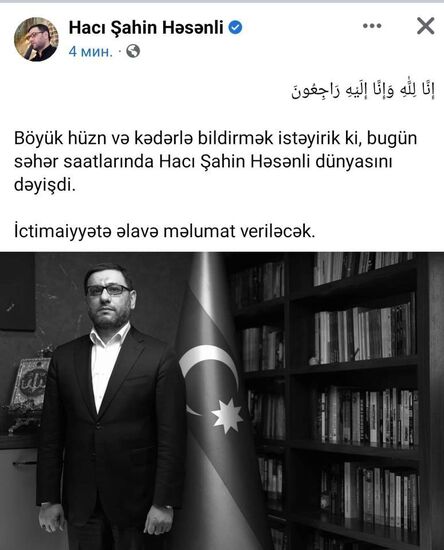 Сегодня в Баку скоропостижно скончался самый, как видно, популярный исламский теолог, богослов, ахунд одной из бакинских мечетей гаджи Шахин Гасанлы. На фото он между Кораном и флагом. Надпись сообщает о его смерти.