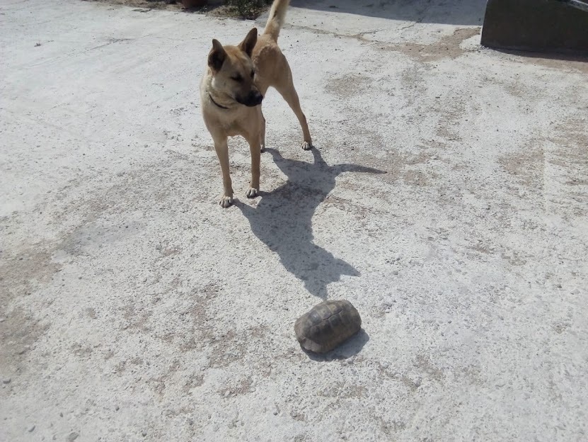Лорд возмущен присутствием черепахи на его территории. Гавкает, прыгает вокруг чудовища. А она то ли не слышит вообще, а скорее знает свои оборонительные возможности и игнорирует источник лая и прыжков. Ясно же, что ничего Лорд поделать не сможет. Черепаха напилась и пошла по своему маршруту.