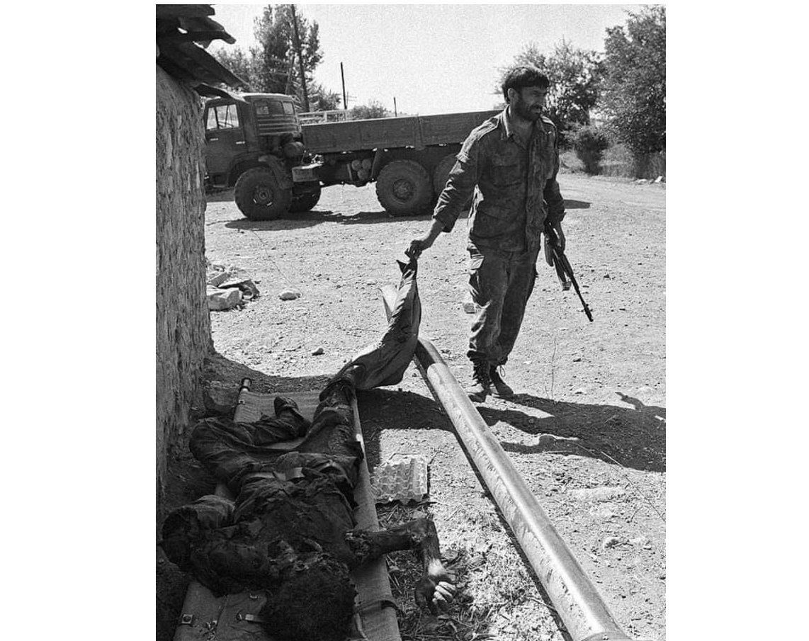 Есть другой фотоснимок его преступных действий во время первой карабахской войны. На фото Хачатрян, держит неясный предмет, вытягивает его с носилок, на которых уложено тело азербайджанского солдата. Что он тянет - Хачатрян скажет скоро на допросах, а может, уже заливается соловьем, надиктовывая имена-фамилии подельников и командиров, перечисляя количество убитых ими и указывая на карте места.