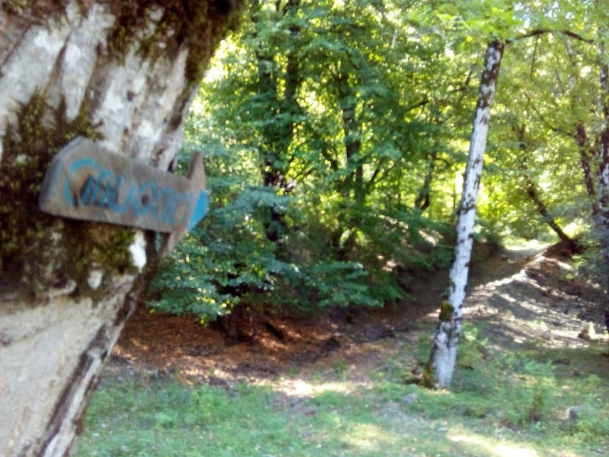 Пошли. Нашли дерево с указателем, пошли по той дороге, дорога зашла в лес и уперлась в поляну заросшую крапивой   и перегороженную упавшим гнилым деревом-березой. Стали искать продолжение дороги, вышли на заросшую гору, пошли вверх по скалам, заблудились, на вершине горы не видели чертовой скалы, пришлось с опаской спускаться со скал, скользя по гнилым листьям, и опять внизу вышли к башне с камерой.