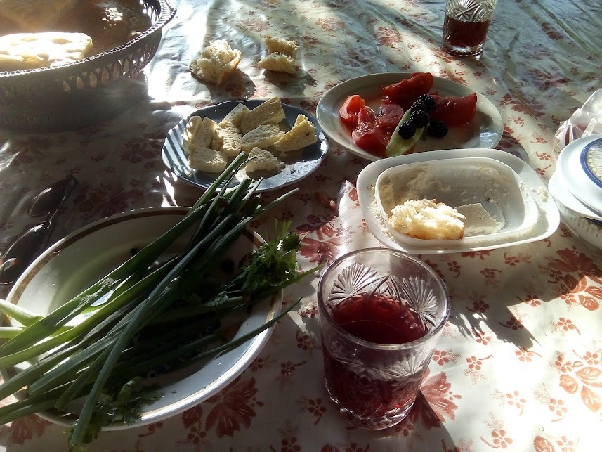 Я не специалист, отдавало одновременно горчинкой, сладким и кислым, но в холодном запотевшем состоянии шло очень хорошо, охлаждая. На столе были также копченая рыба, сыр, хлеб, зеленый лук, курино-вермишельный суп.