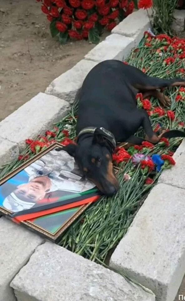 Эта фотография сейчас самая показываемая в азербайджанских сетях. Пес Раффи не уходит с могилы погибшего в последнем бою жителя пос. Сураханы Рамиля Рзаева. Животные преданнее, вернее, честнее людей - такие комментарии.