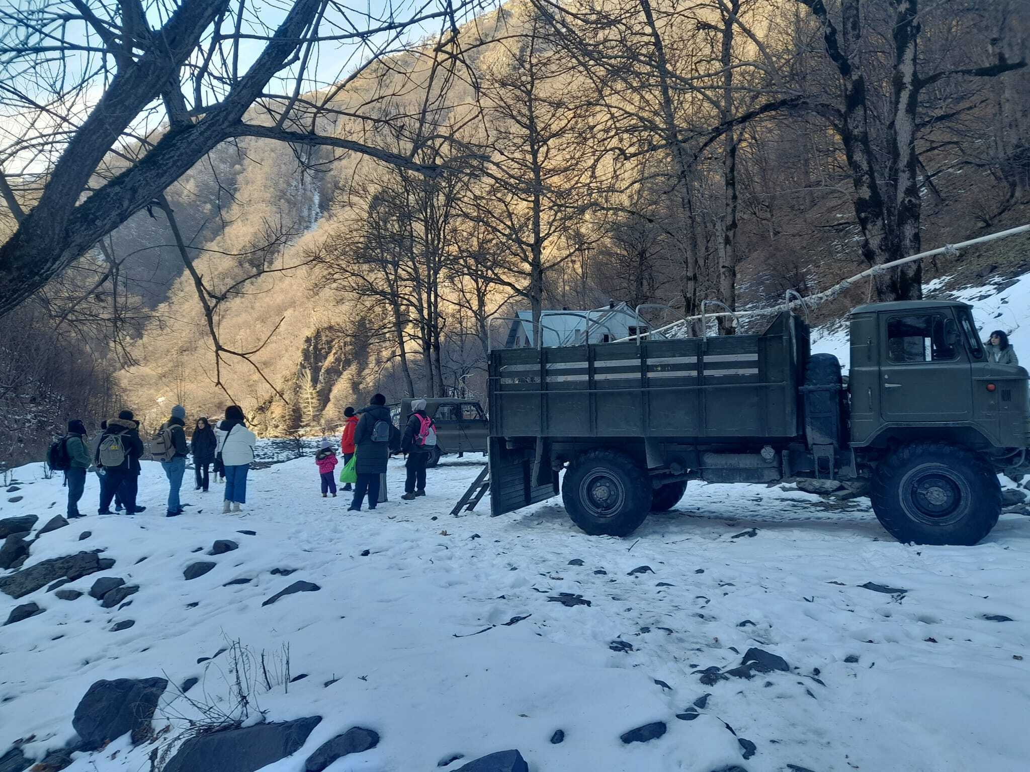 Мои друзья из разных регионов рассказывают о том как они провели новый год. Если составить рейтинг, то лучшими будут илисуинские мои товарищи, постоянно живущие в Илису, Гахе и Загатала. Они собрались, купили продукты, заказали УАЗ и уехали в далекий кавказский лес, к горному горячему водопаду наполняющемуся в бетонно-каменную ванну. Место называется Илисуинская горная баня. 7 км дороги по камням через стремительную холодную реку туда, где сближаются до длины пастушьей палки две горы.