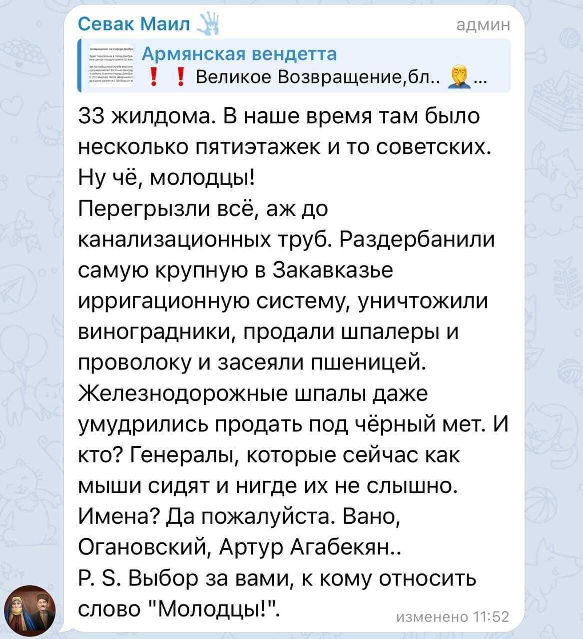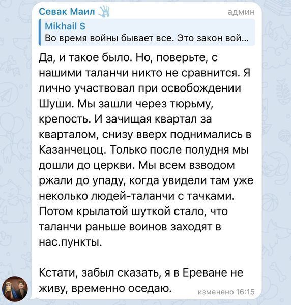 И вот еще по теме. @MaidenTower пишет: Армянин, воевавший в Первую Карабахскую войну (1991-1994) рассказывает о том, как армяне занимались грабежом (талан), вынося из домов азербайджанцев даже зубные щётки. При этом этот же армянин подтверждает, что азербайджанцы грабежом не занимались.