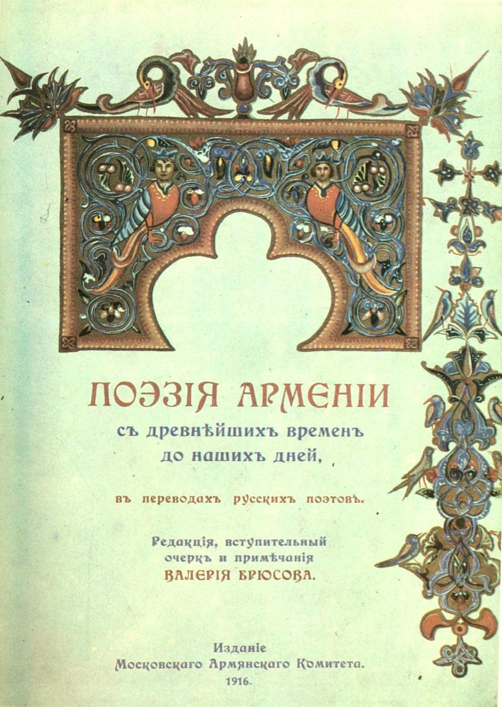 История – далеко не основная тема этого блога, но, когда я его заводил, кое-какие публикации все же планировались. До сих пор я не делал ни одной такой, что считаю своим упущением. Несколько дней назад мне попался на глаза репринт книги 1916 года «Поэзия Армении с древнейших времен до наших дней в переводах русских поэтов» под редакцией Валерия Брюсова. Прекрасное издание, вот его обложка.