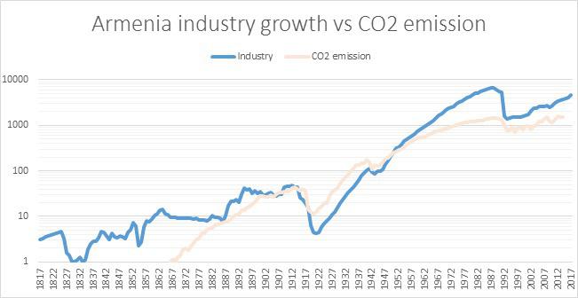 В базах данных по выбросам углекислого газа существует набор данных по Армении. Интересно его сравнить с динамикой промышленного производства. Я совместил эти графики в 1913 году, куда же без 1913 года. В 20 веке промышленность росла быстрее, тогда как в 19 веке это было наоборот. Эти графики скорее должны были бы совпадать, посему, скорее всего статистика выбросов углекислого газа неточна, либо представляет собой определенный процент выбросов Российской империи/СССР, соответственно, отражает динамику России, а не Армении.