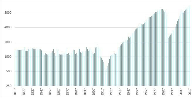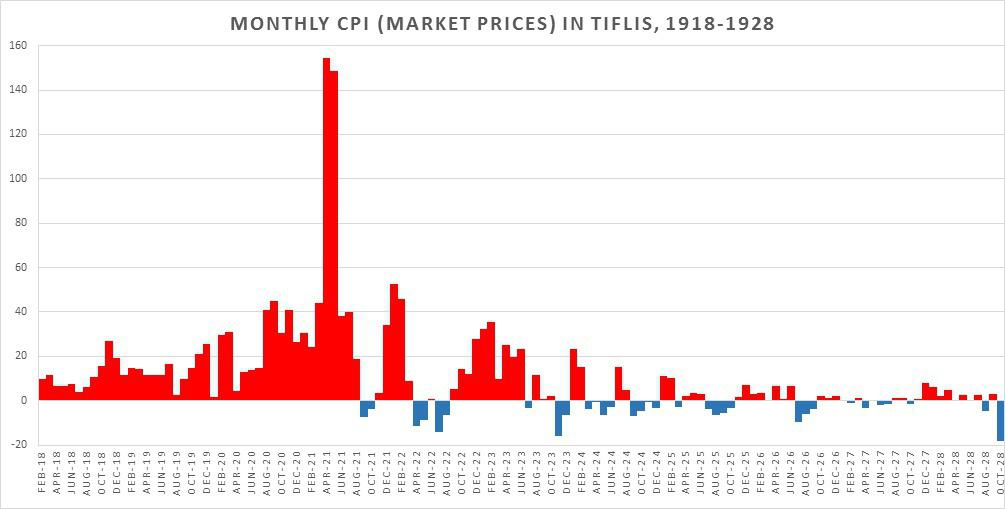 Ежегодный индекс инфляции вплоть до 1914 года (вкл.) оставался стабильным - около нуля. И уже в 1915-1917 гг. он достиг 50-80% в год. Это могло бы показаться катастрофой, если не посмотреть на то, что произошло дальше. В 1918 году рост цен превысил 700% (к предыдущему году), а в 1919 - 600%. К середине 1920 года наметилась определенная стабилизация, но уже в 1921 году инфляция достигла 5000%. Вероятно, это даже хуже, чем в 1990х. Напомню, в феврале 1921 года РККА вошла в Грузию. Потом, еще в 1922-23 гг. инфляция оставалась на очень высоком уровне - и только с 1924 года уже стала терпимой.