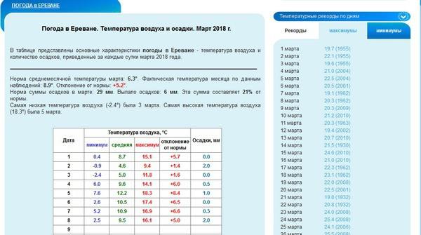 Климатический монитор Еревана находится по адресу: http://www.pogodaiklimat.ru/monitor.php?id=37788 (подставив код другого города, можно найти и данные по этому городу). Кроме того, существует страница текущей погоды в Ереване: www.pogodaiklimat.ru/current/37788.htm (обновляется раз в несколько часов) и архив погоды в Ереване: http://www.pogodaiklimat.ru/weather.php?id=37788 (обновляется раз в три часа и включает в себя как погоду, так и ощущения по погоде, осадки, температуру и многое другое).