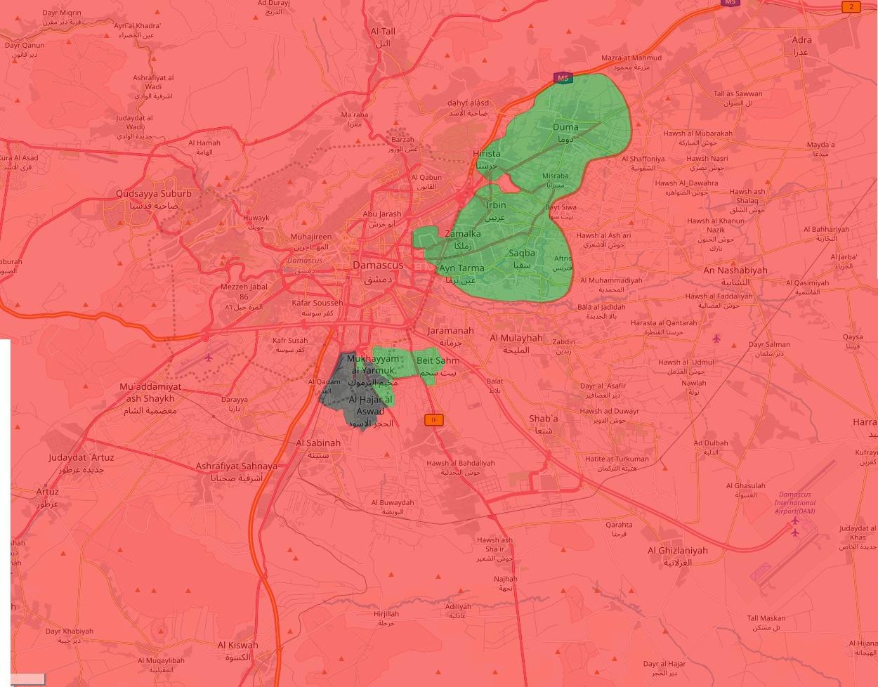 Здесь есть две карты, которые характеризуют ситуацию в округе Дамаска сегодня. Одна - карта 2013 года, согласно которой Асад контролировал только центральный район, аэропорт и ряд дорог, а вторая - карта 9 марта 2018 года, которую я склеил из скриншотов с сайта syriancivilwarmap.com