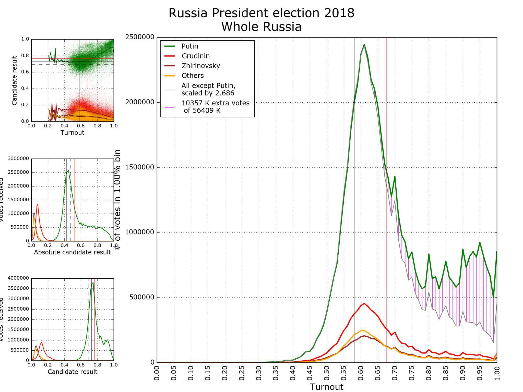 Он основан на предположении, что соотношение голосов Путина и других кандидатов должно быть стабильным вне зависимости от явки, а сам график подчиняться закону нормального распределения. И в целом нормальное распределение на графике видно, но оно размывается вправо довольно сильно. И почему-то, чем выше явка, тем больше голосов за Путина. Шпилькин делает эти анализы уже давно, самым известным является «Двугорбая Россия» - статья, опубликованная в «Троицком варианте» 2 года назад, по случаю парламентских выборов.