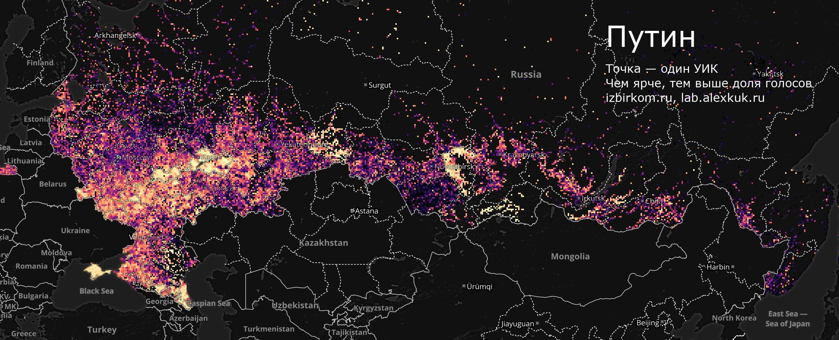 География голосования за Путина довольно интересна. (представленное фото из фейсбука Лаборатории анализа данных Александра Кукушкина)