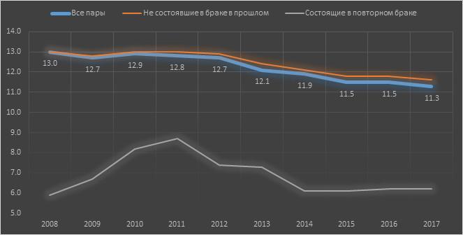 Интересно, что трансформация гендерных ролей сказывается и на готовности женщин вступать в брак после развода. Если раньше мужчины были в большей степени склонны вступить в повторный брак, то теперь это все больше распространяется и на женщин. В 2017 году 12.2% женившихся мужчин вступили в повторный брак и 10.6% - женщин. При этом, 53.5% всех вступивших в повторный брак были мужчинами.