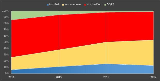 Согласно опросам CRRC, в 2017 году той или иной форме недопустимым развод считали в Грузии 45% и лишь 13% считали его допустимым всегда или почти всегда. Но зато в 2011-2017 гг. заметно выросло число тех, кто считали развод допустимым при определенных обстоятельствах. Некоторые из этих обстоятельств я уже перечислил.