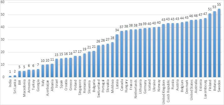График 4. Количество разводов по странам, в % от браков в 2002 году[5]