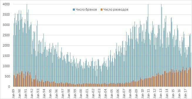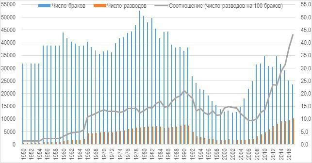 Однако в последние годы количество разводов начало резко расти. С 2007 по 2017 год их число выросло более чем в 4 раза. Что более важно, рост числа разводов совпал со снижением числа браков.