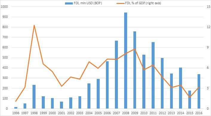 С инвестициями в последние годы у Армении дела обстояли очень грустно. Объем притока прямых иностранных инвестиций постоянно сокращался, а о соотношении притока ПИИ к ВВП и говорить нечего, в последние годы он стабильно был ниже 4%. На графике ниже это представлено: