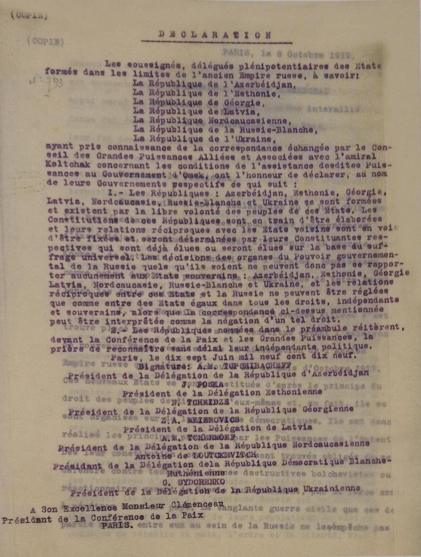 1.4. Обращение делегаций Азербайджана, Эстонии, Грузии, Латвии, Северного Кавказа, Белоруссии и Украины к председателю Парижской мирной конференции, премьер-министру Франции Жоржу Клемансо с просьбой признать эти республики.