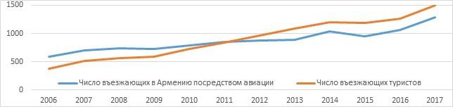 2. Ежегодное число въезжающих туристов в Армению и общее число въезжающих посредством авиации