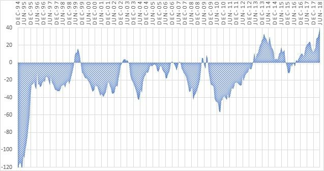 5. Динамика сальдо пассажиропотока, скользящая суммарная за 12 месяцев.