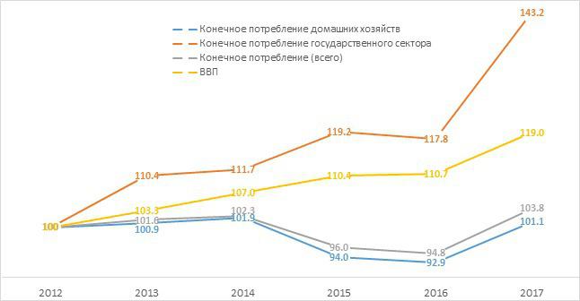 Другой причиной является то, что разной является точка отсчета. Статистика оперирует четко измеряемыми и повторяемыми циклами – это год, квартал и месяц (хотя бывает по-разному). В связи с этим, статистика может показать, что в апреле 2026 года произошел рост по отношению к апрелю 2025 года. При этом, могут не упомянуть тот факт, что в марте 2025 ситуация была таки лучше, чем в апреле 2026 года. Политики часто манипулируют статистической информацией и по этой статье. Когда период роста, тема экономического роста не сходит со страниц лояльных власти газет и телекомпаний. Но если ситуация в экономике не очень хорошая, об этом напоминают только оппозиционеры. Граждан это может раздражать, поскольку человек в любом случае склонен сравнительно скептически относиться к заявлениям о всеобщем улучшении, если сам он столь явного улучшения в своей жизни не видит. Итак, исходная или референтная точка может быть разной и по этой причине то, что статистически выглядит как «взлет», гражданами в качестве такового восприниматься не будет. Когда в 2017 году в Армении конечное потребление домашних хозяйств выросло на целых 8.8%, никто не торопился радоваться, поскольку рост был о сравнению с 2016 годом, а по сравнению с 2012 годом накопленный рост составил всего лишь 1.1%, а среднегодовой рост за 5 лет – примерно 0.2% в год. Согласитесь, заметить такой рост действительно трудно. Для большей наглядности, см. график: