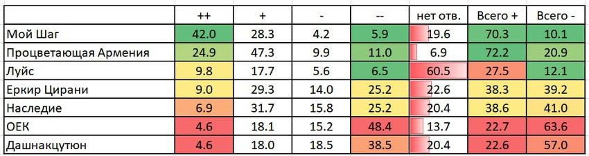 5. Оценки партий – самую позитивную оценку имеет объединение «Мой Шаг» - 42% оценили очень позитивно, 28.3% - позитивно, 10% негативно и 20% не знают или отказались отвечать. Позитивную оценку имеет также «Процветающая Армения», получившая 24.9% полностью позитивных оценок, 47.3% - скорее позитивных оценок, 21% негативных и 7% не ответили. Блок «Луйс» получил 27.5% позитивных и 12% негативных оценок, АРФ «Дашнакцутюн» - 22.6% позитивных и 57% негативных оценок, а партия «Страна Абрикоса» - 38% позитивных и 39% негативных оценок