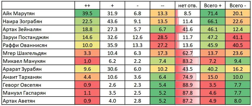 6. Оценки кандидатов в мэры – Айк Марутян – 71.4% позитивных оценок, 20.1% - негативных, Наира Зограбян – 66.1% позитивных, 22.6% - негативных, Артак Зейналян – 46.1% позитивных, 12.4% негативных, Заруи Постанджян – 47.2% позитивных, 41.1% негативных