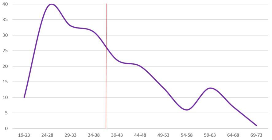 Медианный возраст и здесь ниже среднего, то же касается модального. Медианный возраст составляет 34 года и 1 месяц, то есть на 9 месяцев ниже среднего.