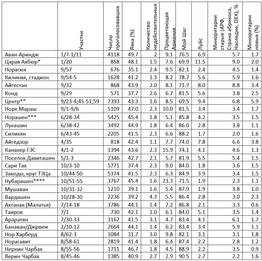 **** Результаты по Нубарашену, вероятно, искажены финансовым стимулированием избирателей в пользу «Процветающей Армении». См. Раздавала ли партия «Процветающая Армения» взятки и если да - то сколько?
