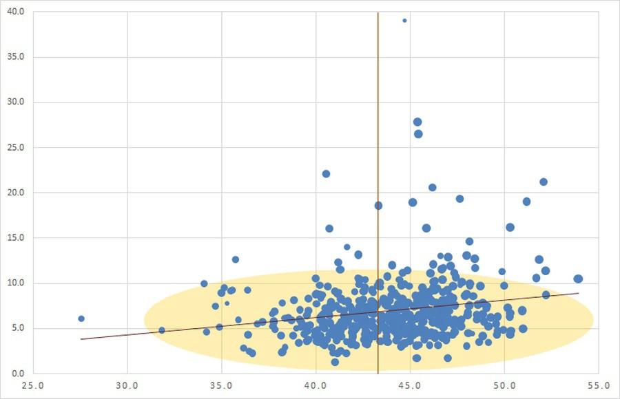 На этом графике – результат «Процветающей Армении», зависимость их результата от явки, овалом отмечены участки, оцененные мной как нормальные, вне его – вверх – аномальные участки. На горизонтальной оси - явка, на вертикальной - результат "Процветающей Армении", размер каждой точки - соответствует пропорции числу проголосовавших на данном участке.