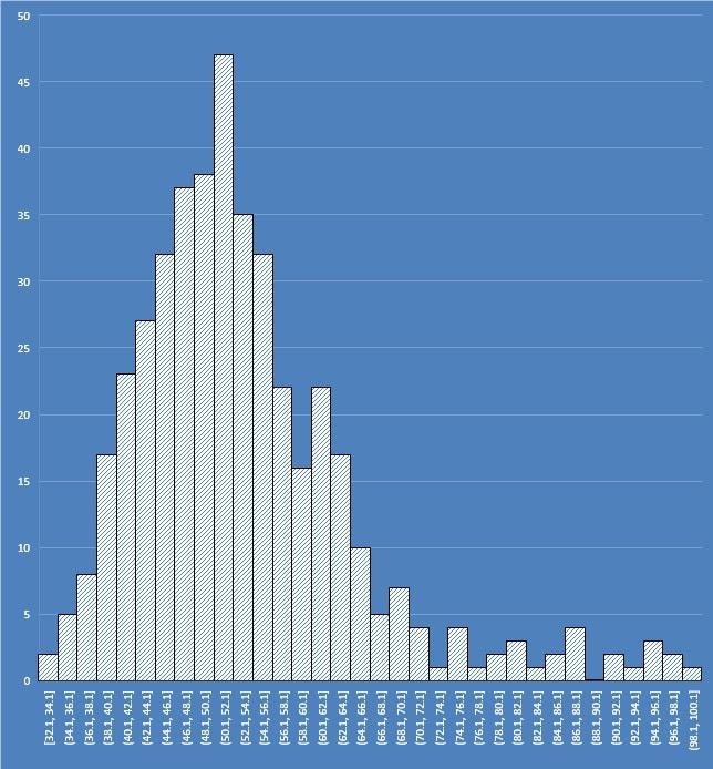 График 4. Гистограмма распределения числа участков по явке, на выборах 2013 года