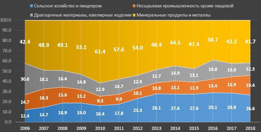 Экспорт сырьевого сектора экономики Армении в 2017-2018 гг. достигает уже почти миллиарда долларов, что очень значительно и составляет порядка 40% всего экспорта страны. Однако доля сырьевого сектора в промышленности составляет 33%, а в валовой добавленной стоимости – всего 6%, при том, что экспорт сырья составлял 8.2% ВВП.