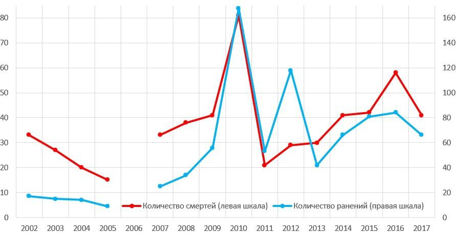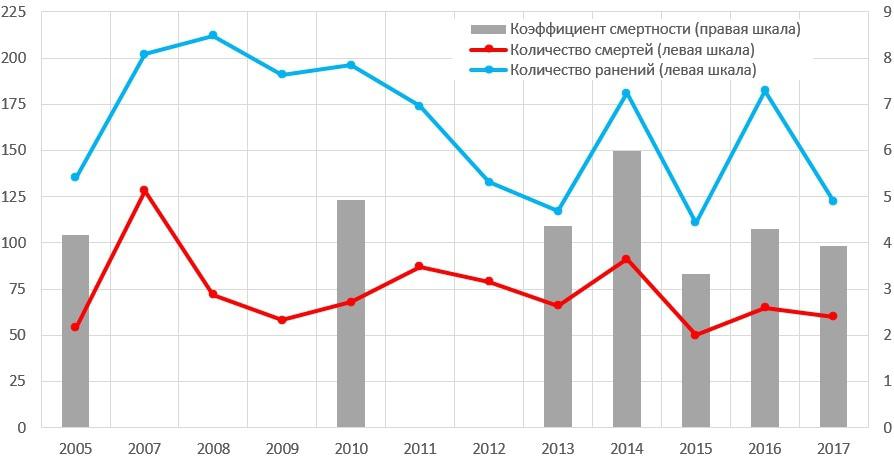 Однако даже самый поверхностный анализ статистики может показать, что это не так. Количество ранений и смертей в 2002-2005 гг. имело очень отчетливую тенденцию к сокращению и сейчас не превышало бы 10 случаев в год; оно уже было близко к этой линии в 2005 году, когда число погибших на рабочем месте составило 15 человек. Уже в 2007 году это число составило 33 человека, то есть выросло более чем в два раза. По сравнению с 2005 годом, среднегодовая смертность в 2007-2017 гг. была больше почти в 3 раза или на 176%. Таким образом, действительная оценка сверхсмертности, являющейся результатом данной реформы, должна составить от 316 до 376 человек, если в первом случае исходить из стабильной смертности в 15 человек в год (неизменный уровень 2005 года), а во втором исходить из сокращения смертности до 10 человек в год. Данные цифры также включают приблизительную оценку за вторую половину 2006 и первую половину 2018 года.
