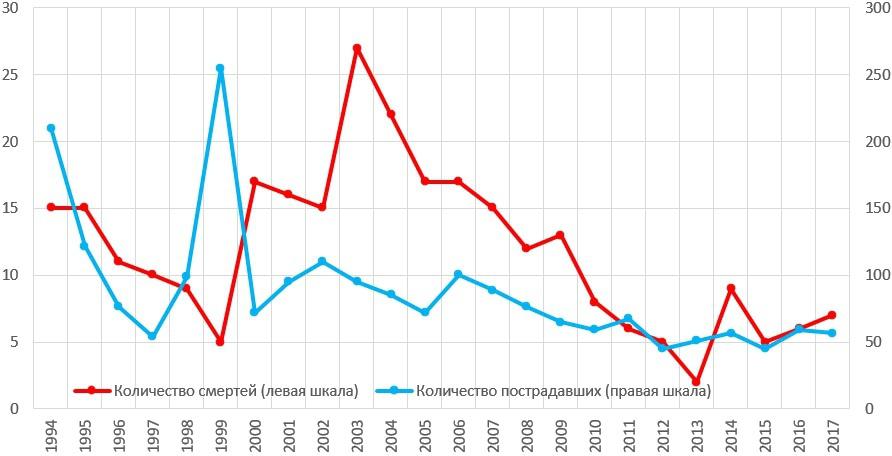 График 2. Количество смертей и число пострадавших на рабочем месте в Армении, 1994-2017