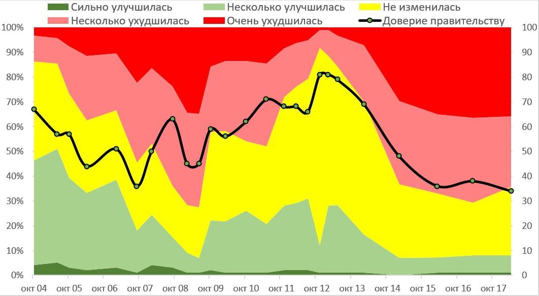 Как мы видим, существует взаимосвязь между уровнем доверия правительства и оценкой экономики: в случае воспринимаемого экономического успеха, растет уровень доверия правительству, и наоборот – при высоком уровне доверия правительству, люди склонны воспринимать экономическую ситуацию более положительно. Уровень позитивных оценок ситуации в экономике Грузии катастрофически обвалился в 2014 году, поскольку жители Грузии потеряли некоторые источники дохода – перепродажа автомобилей, денежные переводы из-за рубежа.