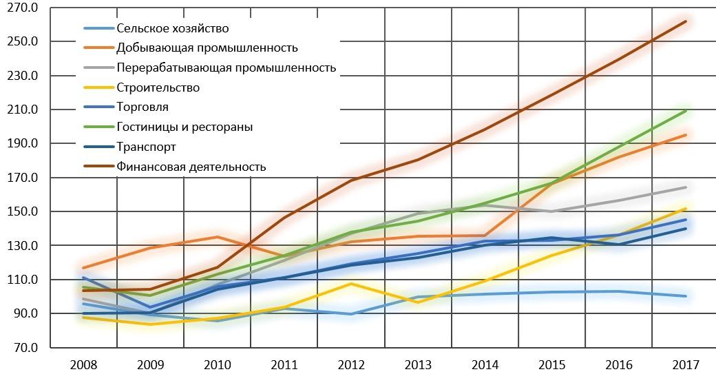 Иллюстрация 2. Динамика ВВП Грузии по отдельным секторам (в % к 2007 году)