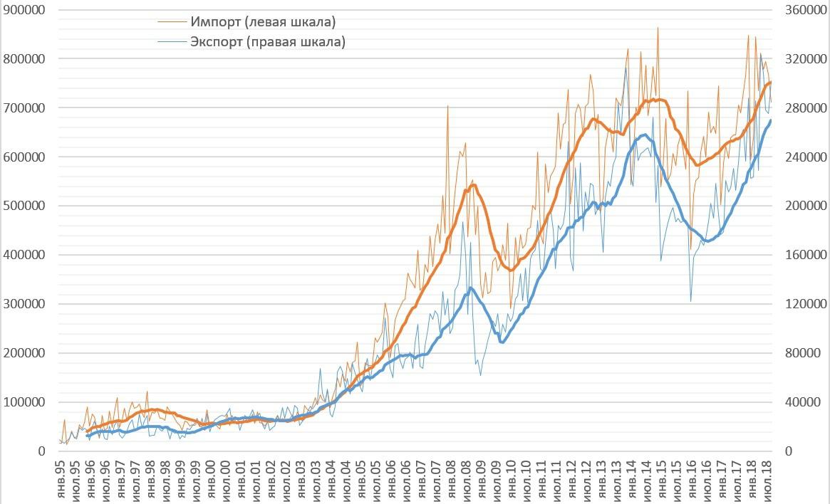 Примечание: импорт отсчитан на левой шкале, экспорт – на правой. Жирная линия – скользящее среднее за 12 месяцев.