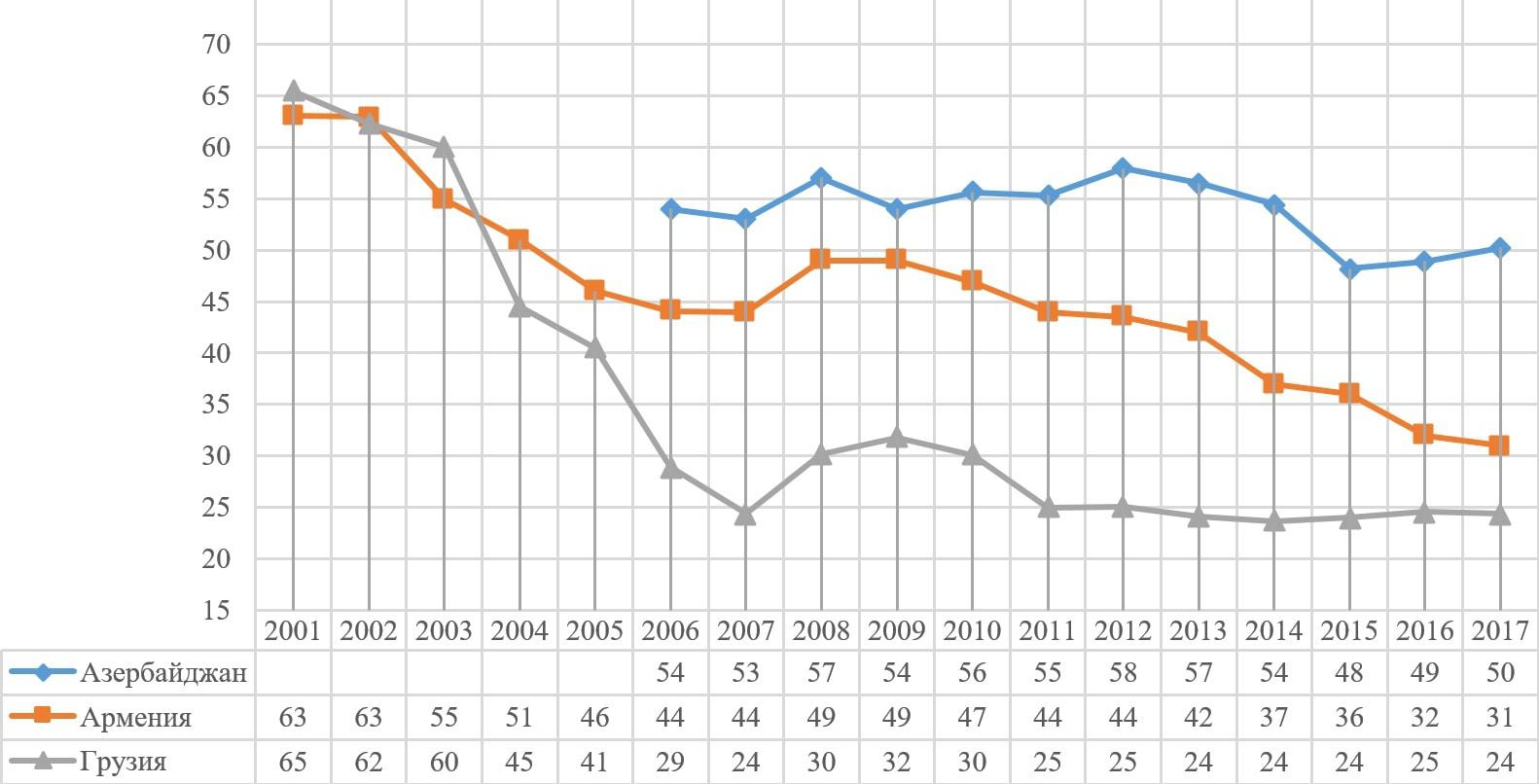 Как мы видим, среди стран Южного Кавказа, Армения лидировала по всем выбранным параметрам в 1996 и 2003 гг. Однако в более поздний период она уступила лидерство Грузии. После 2003 года Грузия провела самые значительные реформы в регионе Южного Кавказа и добилась значительных результатов по международным меркам. Прогресс Армении был гораздо более медленным. В то же время, необходимо отметить прогресс Азербайджана, который был медленным, но постоянным и к 2017 году отставание Азербайджана несколько сократилось.