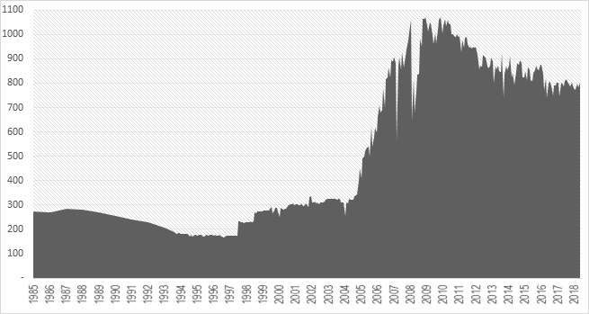 График 1. Динамика среднесуточных показателей добычи нефти в Азербайджане, 1985-2018