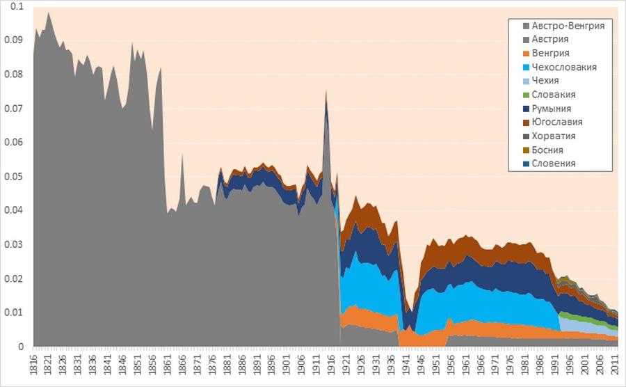Здесь график точен не до конца, поскольку и Румыния, и Югославия лишь частично входили в состав Австро-Венгерской империи. В то же время, в нее входили также части Украины и Италии и с точки зрения понимания динамики, думаю, мы на этом графике видим ее достаточно точно. Учитывая, что большинство югославских республик также включены в этот график, смысла делать отдельный график по Югославии нет.