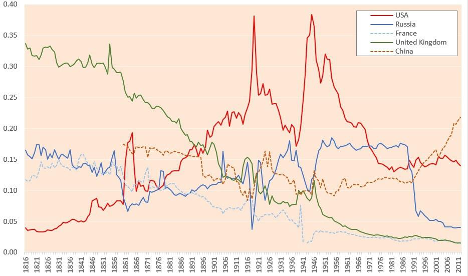 Наконец, вкратце о динамике других стран на графике. Относительная мощь Франции медленно снижалась на протяжении всех двухсот лет, и будет продолжать снижаться. В случае Великобритании, это происходило быстро, но сейчас обе страны на одном и том же уровне. Приведем отдельные данные в виде таблицы.