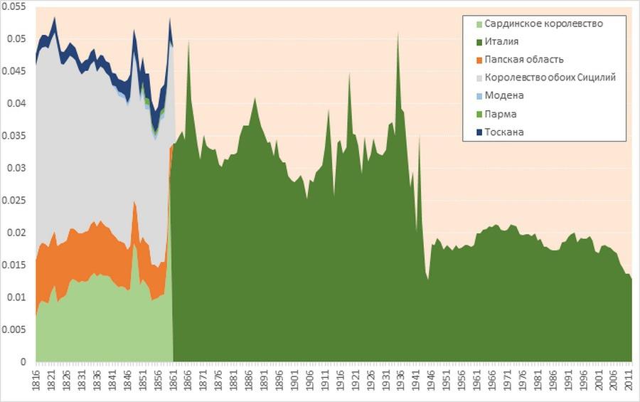 Самой интересной в этом смысле является Германия, которая в начале XIX века не была единым государством, но составляла Германский союз, в который также входила часть Австро-Венгерской империи. Германия была в основном объединена Пруссией в конце 1860-ых – начале 1870-ых в ходе ряда войн. База данных предоставляет возможность рассмотреть динамику не только объединенной Германии, но и отдельных немецких государств.
