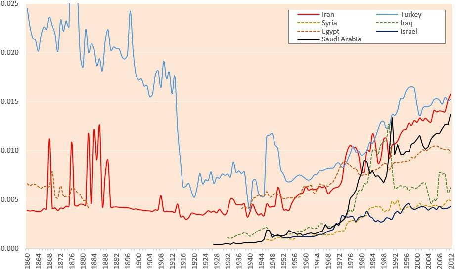 Иран, который, можно сказать, испытал свое столетие унижения также быстро усиливается и даже в 2012 году обошел Турцию. Возможно, сейчас Турция вновь впереди, поскольку на развитие Ирана тяжелой ношей ложатся санкции, но даже тот факт, что сила Ирана и Турции сейчас сопоставимы, иранцы могут записать себе в актив. Конечно же, на нефтяных «харчах» хорошо поднялась Саудовская Аравия. Египет скорее являет собой историю неуспеха – тут есть данные за конец XIX века, когда Египет только ослабевал и уже начиная с 1930-ых гг. Египет, вместе со всем регионом, конечно же, показал рост, но совершенно не соответствующий его приросту населения, который был и остается по сей день, совершенно невероятным.