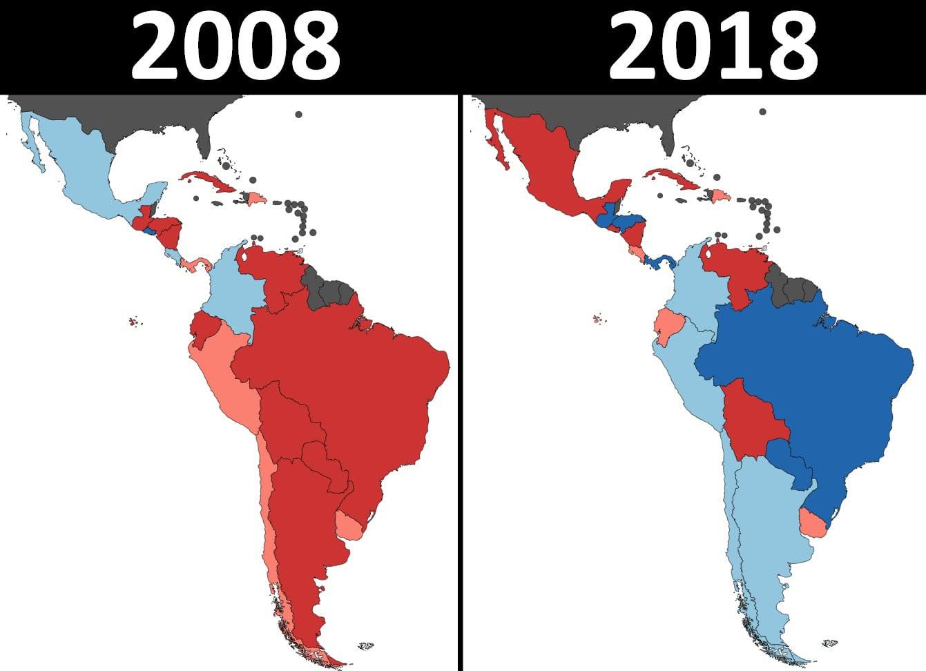 Карта политической направленности властей стран Латинской Америки, 2008-2018. Источник – Reddit/MapPorn, автор – u/jmam2503.