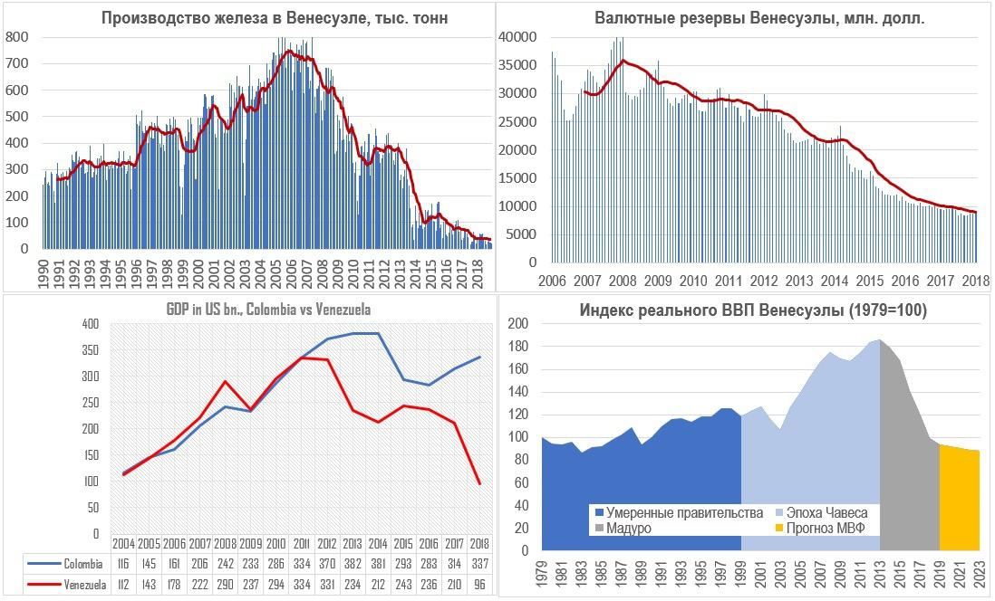 В 2018 году объем производства ВВП уже меньше, чем в 1979 году. Мадуро довел страну до кризиса, из которого, как кажется, уже нет выхода, провел нелегитимные выборы и фактически узурпировал власть. Причем это совсем не то же самое как на постсоветском пространстве, когда оппозиция говорит, что власть проигрывает выборы, но твердых доказательств тому не имеет.