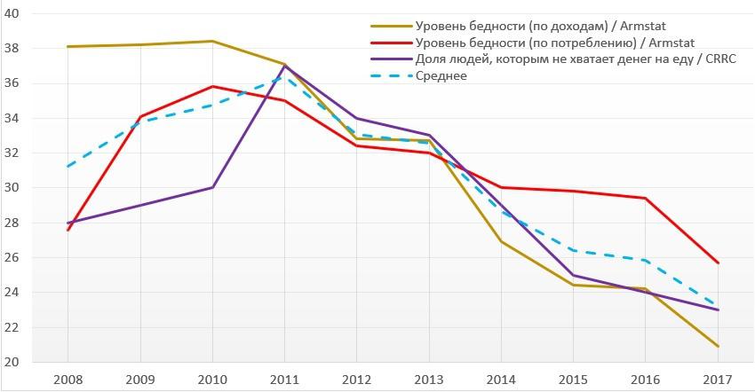 График 1. Уровень бедности в Армении, по опросам, 2008-2017