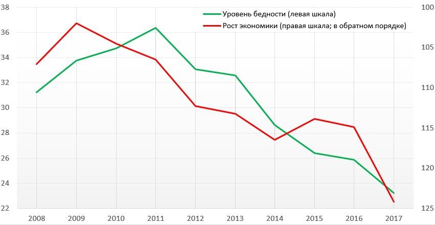 Если рассмотреть приведенные два графика, легко заметить, что они разнонаправленные – в целом, несмотря на всплеск после кризиса 2009 г., уровень бедности имел тенденцию к снижению, а макроэкономические показатели, соответственно, к росту.