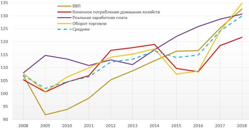 Итак, если в первом графике мы видим динамику уровня жизни, измеренную на уровне домашних хозяйств, то во втором – на уровне всей экономики. При этом, первый график основан на выборочных исследованиях, поэтому имеет погрешность исследования, а второй точен, но не измеряет непосредственно объект исследования (уровень жизни населения), так к примеру, на ВВП, торговлю и конечное потребление могут влиять такие показатели как экспорт, туризм и т.д., а зарплата, хотя и влияет на уровень жизни, но в то же время, на уровень жизни влияет изменяющийся уровень занятости (которая постепенно сжималась на протяжении последних лет из-за растущей производительности труда).